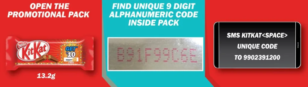 - You can buy Nestle Kitkat worth 20 Rs or 25 Rs from local stores. Make sure that amazon offer is mentioned on the wrapper. If there is no such promotional communication, then you won’t be eligible for the offer.