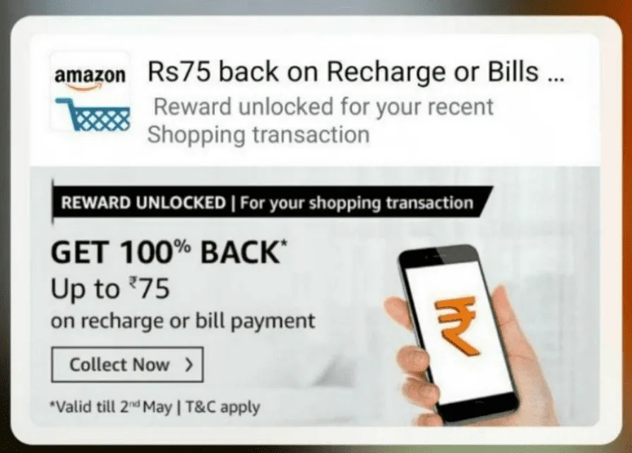 You can Unlock Shopping & Recharge Rewards with Amazon UPI, Amazon Shopping. Below is the offer Where You Can Get Free Recharge of Rs.75  For Doing a Shopping worth Rs.100 or more. This is a User-Specific offer. We have added the steps mentioned below to check eligibility and Steps to get the offer.