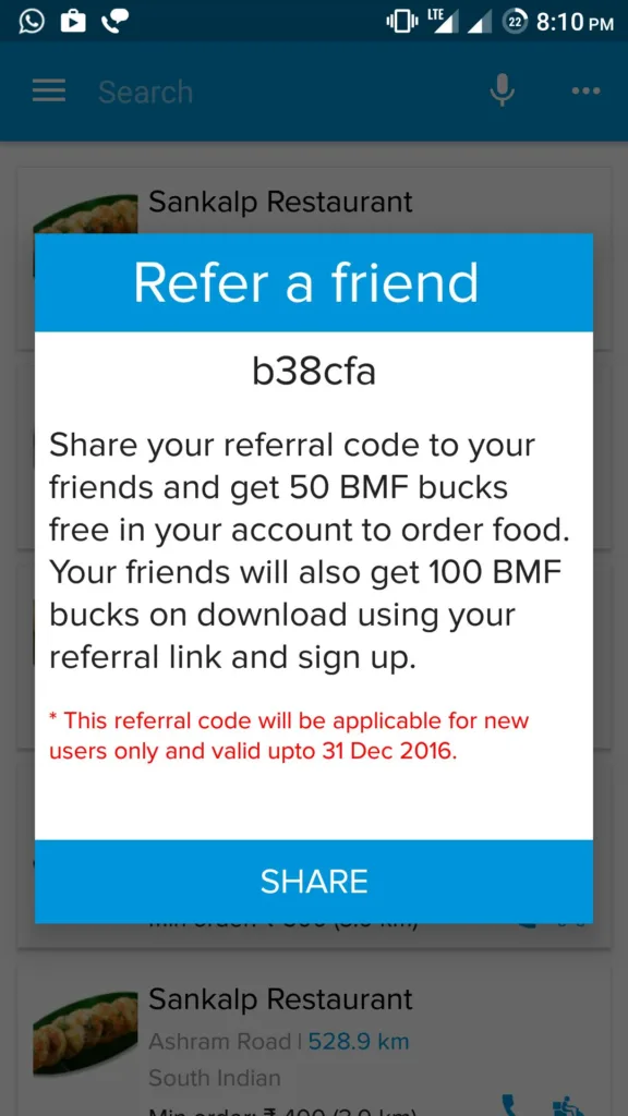 Bookmyfood is A Food ordering app to order food anywhere in india . bookmyfood allows users to order food from various different food joints with delivery or pick up options in a most easiest & fastest way. Bookmyfood currently running an refer and earn program. Bookmyfood offering Rs. 100 for Download via Referral and 50 BMF Bucks Referrer. Each BMF Buck is equivalent to 1 rs. these BMF Bucks can be used across all Restaurants listed on BookMyFood. So hurry and use this offer as soon as possible