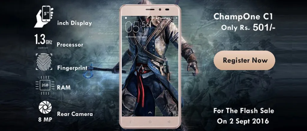 This Phone Has Amazing Features aS described by website having 1.3Ghz Octacore Processor ,2 GB Ram,8 Mp rear Camera,Fingerprint Scanner And 5 inch Display Will Cost Minimum Around Rs.9000 But Champ1 Offering It Free. So if you are interested in this device, then now is the time. To purchase this, you can register yourself for the flash sale with Cham1india. The registration for the same started on August 22nd. Post registration, users will have to log in on www.champ1india.com on the flash sale day i.e. 2nd September, and if you ar lucky, then you will be getting this device for just 501 INR. Do make a note the the offer is available only for Cash on Delivery. Stay tuned for more info on this in coming days.