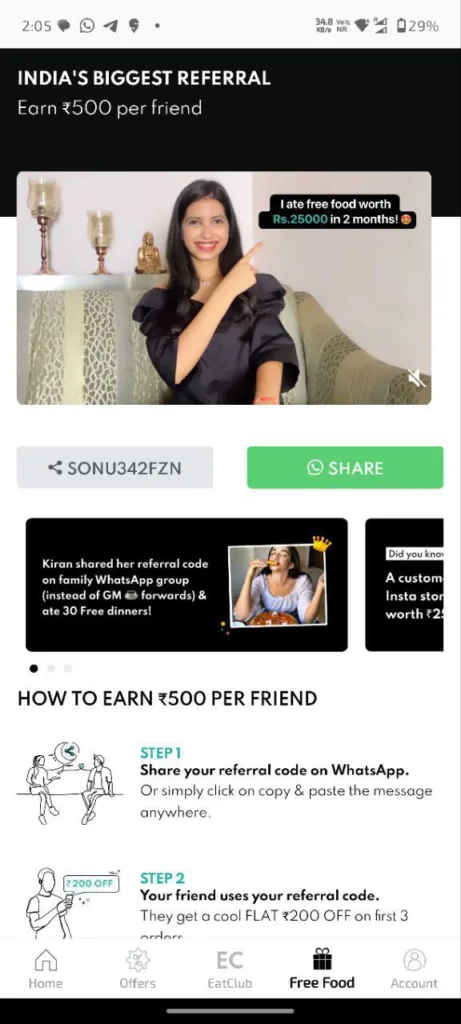 For every friend you successfully refer to Eatclub, you earn a generous ₹500 in cash. This isn’t just credit; it’s actual money that gets credited to your account, which you can use for future orders. you canjust share your referral code from free food section.