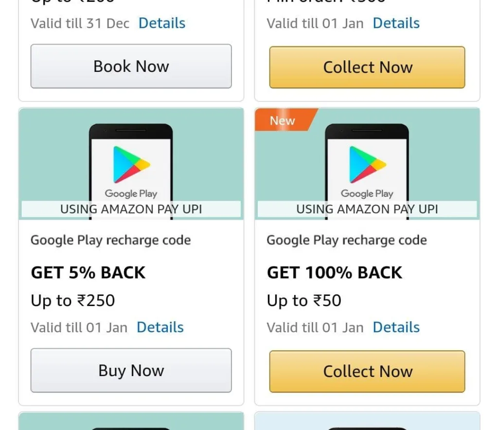 • 2. Reward is applicable on your Google Play recharge code. This offer is only applicable if you select Amazon Pay UPI and Pay (Ex: Amazon Pay UPI SBI *******1234) or select UPI and choose the Set up Amazon Pay UPI option and Pay. Cashback is not applicable if you are manually entering your @apl handle in the UPI payment option.