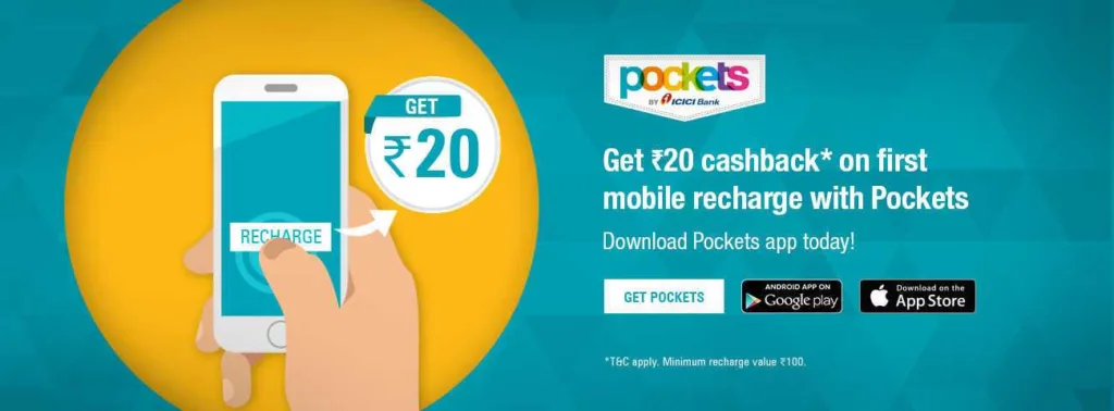 ICICI Pockets App :- Get Rs 20 Cashback on First Mobile Recharge of Rs 100 or More. Pocket App also Gave 25 Rs Cashback On 250 And Now Here Is a cashback Offer, Even Now You Can Chat With Friends