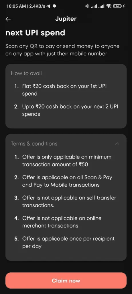 4. Make your first UPI transaction: Perform any UPI transaction using Jupiter. You’ll receive Rs.20 cashback within 24 hours.