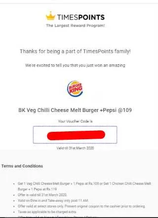 Burger King® India / TimesPoints reserves the right to change the period/ term/ products available and also reserves the right to change/ withdraw/ modify the terms and conditions of this Offer, at any time at their own discretion without any prior notice.
