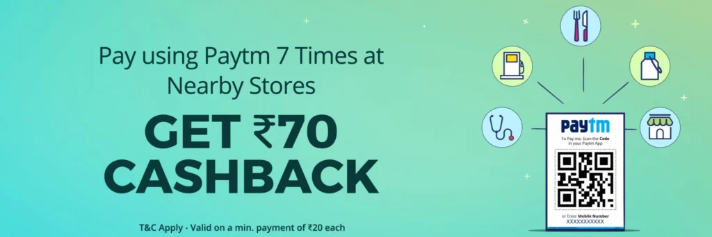Paytm Is Come up With A new Pay With PayTM offer paytm is Offering Rs.70 cashback On paying using Paytm on Your Nearby Stores.You will get Rs.70 cashback On Making 7 Transactions.The Cashback will Be credited once you Complete 7 Transaction of Rs.20 or more. You Can transact till 31st May 2018 So avail this Loot Offer From Paytm One Plus Point If You Don’t have merchant Account You can get it in just Two minutes just Follow This trick – Get Paytm merchant Account in 2 Minutes